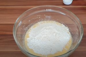 Do mísy dejte jedno vejce a žloutek z dalšího vejce (bílek použijete později). Vyšlehejte do pěny. Poté přilijte olej a opět prošlehejte. Nakonec přisypejte 180 gramů mouky, prášek do pečiva a vanilin. Pokud ho nemáte, použijte dostatečné množství vanilkového cukru. Vymíchejte hladké těsto.