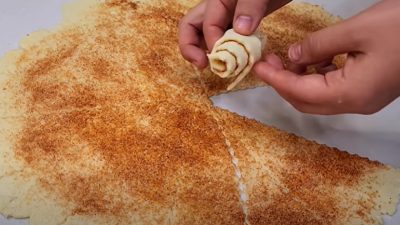 Těsto nařežte na 16 stejných trojúhelníků, které zarolujte ze širší strany a vyskládejte na plech, pokrytý pečicím papírem. Dezert pečte v předehřáté troubě na 180 °C po dobu 25–30 minut. Po vychladnutí ho servírujte posypaný moučkovým cukrem.