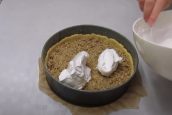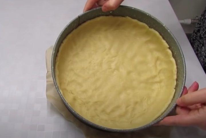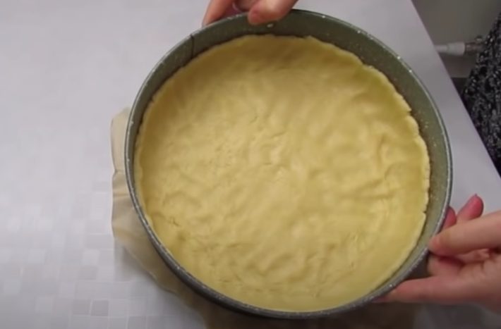 Dortovou formu o průměru 24 centimetrů vyložte pečicím papírem. Těsto rozdělte na větší a menší polovinu, tu menší zabalte a dejte do lednice. Můžete ji dát i do mrazáku, pokud ji chcete později strouhat. Z větší poloviny těsta udělejte ve formě mističku s okrajem.