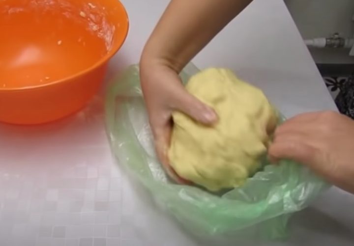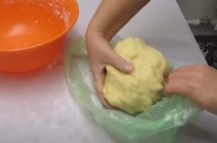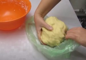 Do mísy dejte změklé máslo a utřete ho s cukrem. Z vajec oddělte žloutky a bílky. Žloutky promíchejte s máslem a cukrem, bílky si odložte na později. Ke žloutkové směsi přidejte mouku a prášek do pečiva. Poté těsto zpracujte rukou, musí být hladké a nelepivé. Zabalte ho do fólie a dejte na půl hodiny do lednice.