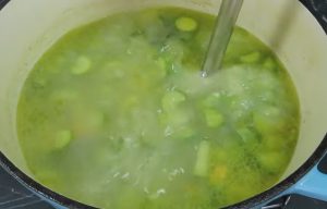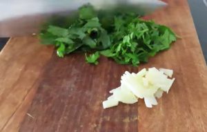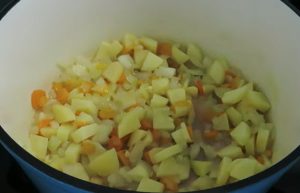 Smažte ji na středním plameni cca dvě až tři minutky, dokud nezesklovatí. Poté k ní přidejte mrkev a česnek, znovu míchejte a smažte je další dvě až tři minuty. Následně přidejte brambory a čekejte další tři minuty, opět míchejte. Přidejte do směsi cuketu a vše dochuťte solí a kmínem, poté dodejte i petrželku a celer.