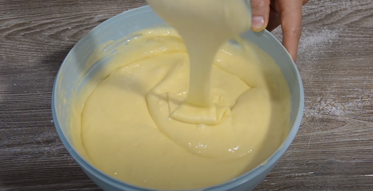 Na pečení je ideální plech o rozměru 28 x 36 cm. Připravte si těsto. Vejce, cukr a vanilkový cukr šlehejte mixérem 7-10 minut na vysokou rychlost. Přidejte mléko a míchejte mixérem na nízké otáčky. Přidejte mouku s práškem do pečiva. Míchejte stěrkou.