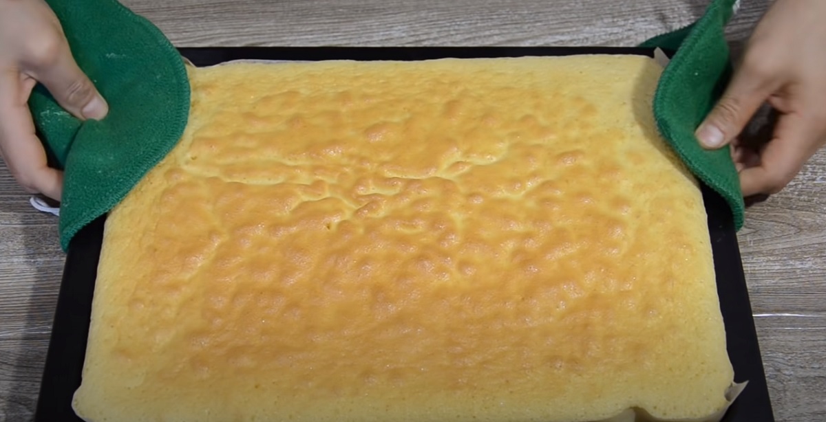 Těsto dejte na plech vyložený pečicím papírem a rovnoměrně rozetřete. Pečte po dobu 25 minut na 180 stupňů. Zkontrolujte párátkem a nechte zcela vychladnout. Rozřízněte jej na dvě stejné části.