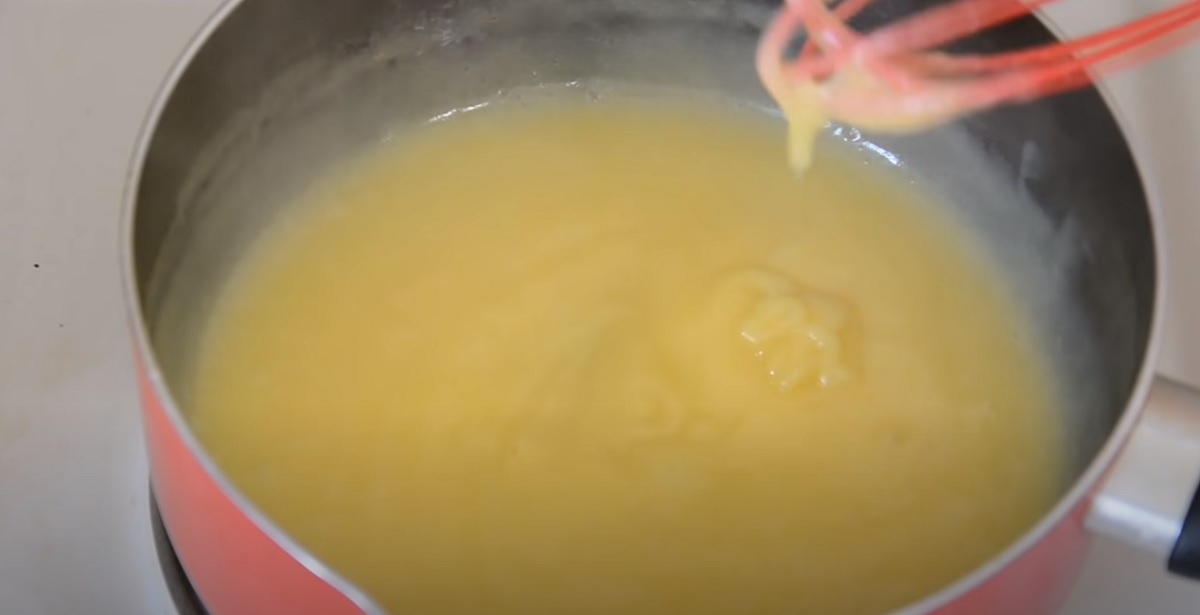 Nyní připravte krém. Do kastrolu dejte vejce, cukr, vanilkový cukr a mouku. Míchejte do hladka. Pomalu přidávejte mléko a důkladně promíchejte. Vařte, dokud nezačne houstnout.