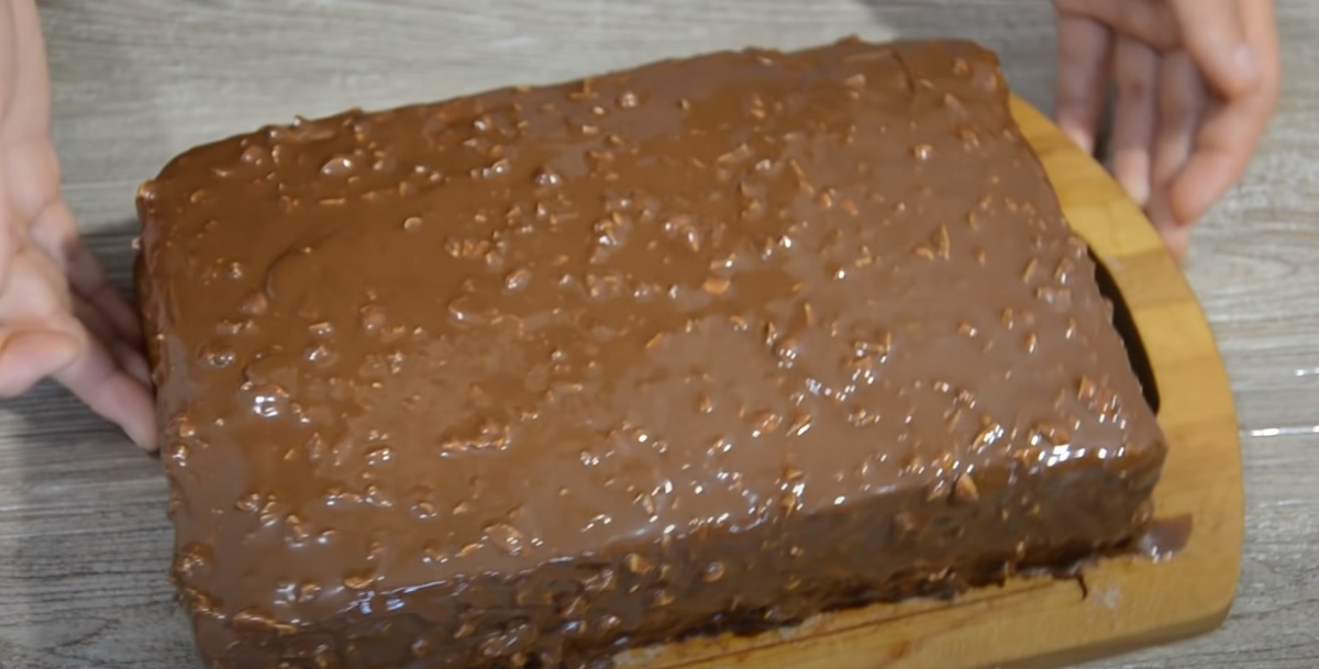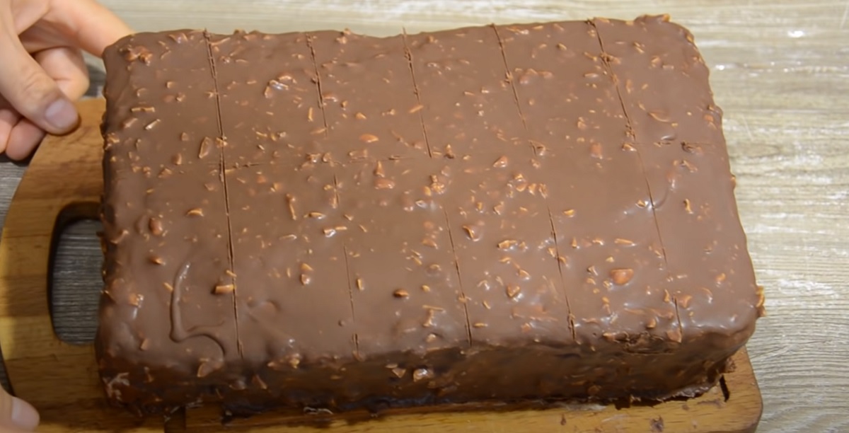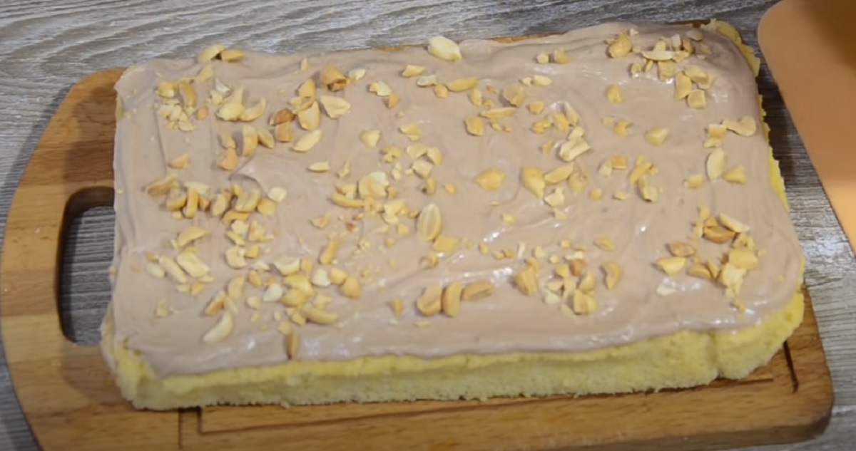 Nyní připravte sirup. Smíchejte horkou vodu a cukr. Sirup nechte vychladnout. Nakonec dezert sestavte. Dejte první díl na talíř. Naneste sirup, polovinu připraveného krému a rozdrcenými arašídy.