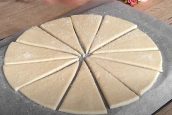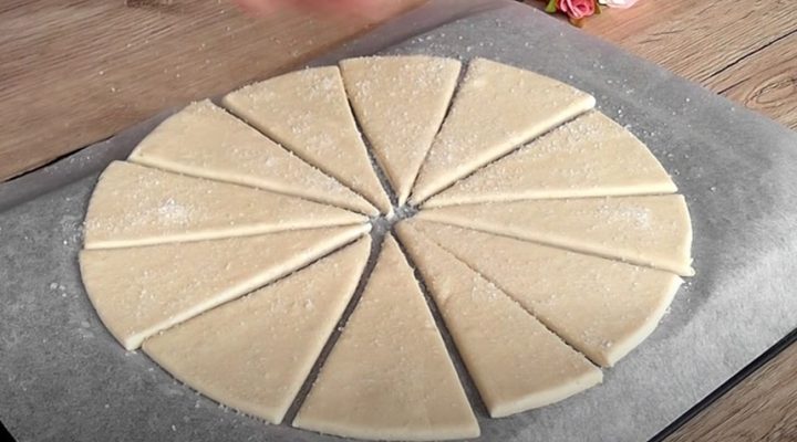 Vezměte oba pláty listového těsta a dortový kroužek o průměru 22 cm. Z těsta vykrojte dva kruhy. První kruh propíchejte vidličkou, potřete vodou a posypejte krystalovým cukrem. Druhý kruh kolečkem na pizzu rozkrájejte na 12 dílů, potřete vodou a pocukrujte. Dejte kruhy i s odřezky těsta na plech, vložte ho do předem vyhřáté trouby na 200 °C a pečte 15 až 20 minut.