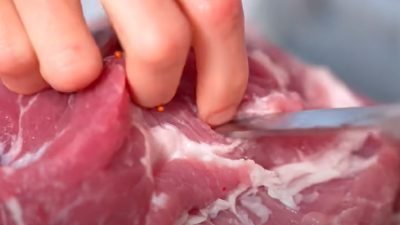 Celý povrch prošpikovaného masa pokryjte zbytkem marinády, zakryjte ho potravinovou fólií a nechte marinovat 2–3 hodiny při pokojové teplotě.