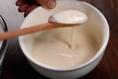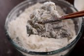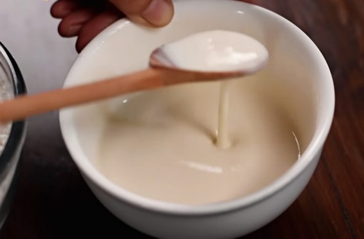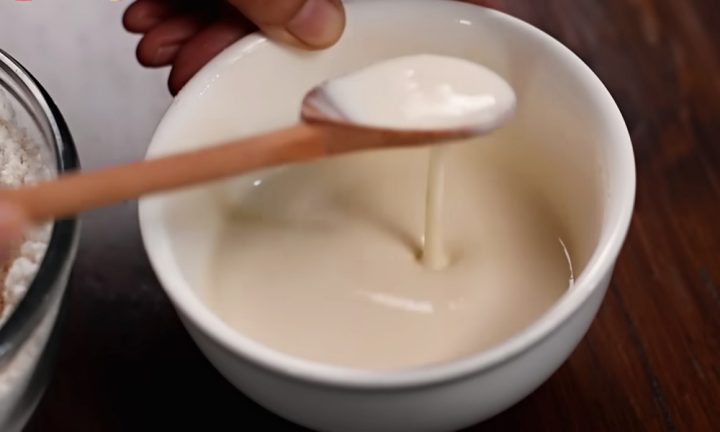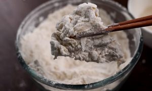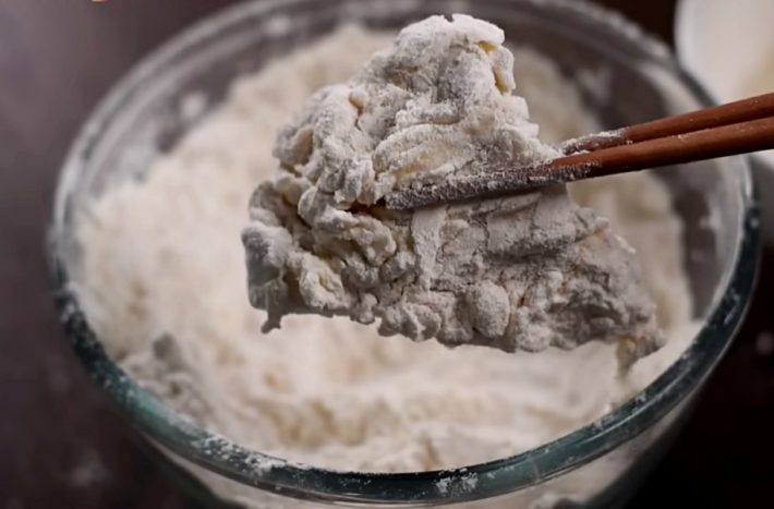 Do mísy prosejte hladkou mouku, přidejte k ní půl lžičky soli, tři čtvrtě lžičky prášku do pečiva, 1 lžičku práškového bujónu a všechny suché přísady dobře promíchejte. Tři nebo čtyři lžíce odeberte stranou do menší misky a nařeďte je asi 4 až 6 lžícemi vody. Použijte jí tolik, aby bylo možné směs rozmíchat do hladké a tekutější, avšak stále dostatečně husté konzistence.