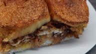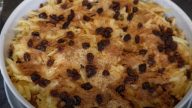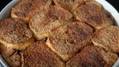 Náplň zakryjte vrstvou veky, namočené v mléce, kterou posypte směsí cukru a skořice. Pokrm pokryjte několika plátky másla a pečte ho v předehřáté troubě na 180 °C po dobu 37 minut.