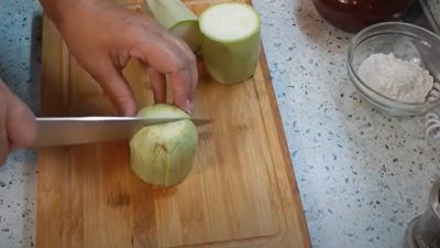 Z omyté cukety odřízněte okraje, zbytek zeleniny nakrájejte na hranolky a pokračujte s přípravou ingrediencí na obalení.