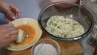 Nasekané bylinky smíchejte s nastrouhaným sýrem a strouhankou. V samostatné misce smíchejte rozšlehaná vejce se solí, pepřem a do další misky vsypte prosetou mouku.