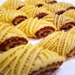 Obě rolády posléze nakrájejte zešikma vroubkovaným nožíkem, abyste získali ozdobné vlnkovité okraje. Povrch sušenek nakonec ještě dolaďte pomocí čisté kosmetické pinzety. Díky ní vytvoříte krásné tvary a linie. Až všechny kusy ozdobíte, položte je na plech s pečícím papírem a dejte péct do trouby na 40 minut při 180 °C. Podávejte vychladlé s oblíbeným nápojem.