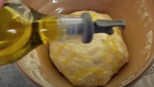 Do mísy prosejte hladkou mouku. Přidejte droždí, sůl a vše promíchejte. Poté přilijte teplou vodu, promíchejte a vypracujte hladké nelepivé těsto. To pomažte ze všech stran olivovým olejem. Mísu přiklopte a nechte těsto 60 minut kynout.