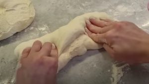 Poté těsto několikrát protáhněte (viz video) a nechte kynout 20 minut. Poté ho opět protáhněte a nechte 15 minut kynout. Pak ho vyklopte na pomoučněný vál. Rozdělte ho na dvě části a každou poskládejte – protáhněte dvě strany naproti a přeložte ke středu. Totéž proveďte se zbylými protějšími stranami a vytvarujte bochánek. Stejným způsobem zpracujte druhou polovinu těsta. Oba bochánky dejte na plech vyložený pečicím papírem, přikryjte a nechte 30 minut kynout.
