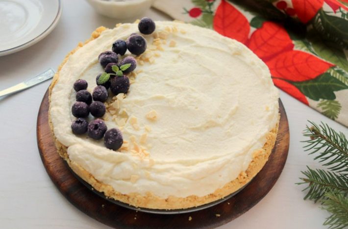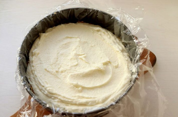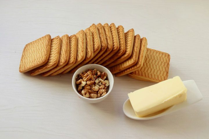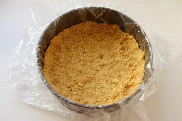 Nejdříve si připravíme základovou desku pro dort. Potřebovat budete sušenky, měkké máslo a hrst vlašských ořechů. Sušenky, ořechy a máslo umelte v mixéru do hladka. Formu s odnímatelným dnem vyložte potravinářskou fólií. Rozložte do ní těstovitou hmotu a důkladně upěchujte lžící. Formu vložte na chvíli do mrazáku.