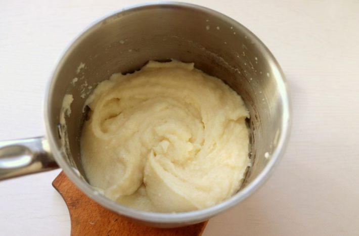 Na samotnou směs z krupice si připravte hrnec. Nalijte do něj mléko a uvařte krupici. Poté do ní přidejte cukr a vanilku. Míchejte kaši, dokud nebudete mít pokojovou teplotu.
