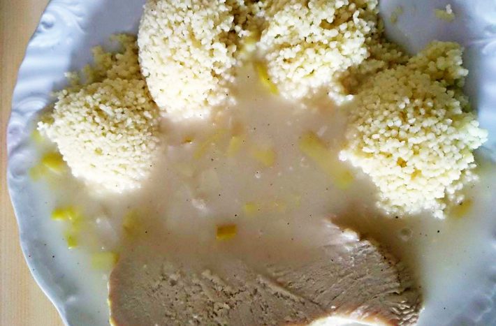 Nabobtnalý kuskus podávejte s několika plátky krůtích prsíček a vše přelijte pórkovou omáčkou.