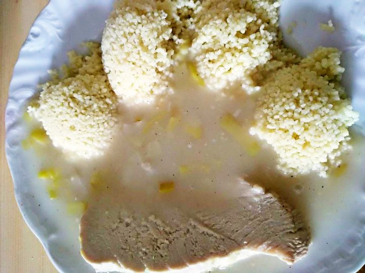 Zatímco se krůtí prsa s pórkem vaří, promíchejte v míse kuskus s trochou sušené zeleniny a soli a zalijte ho vroucí vodou (poměr by měl být asi 2:3). Misku zakryjte poklicí a nechte kuskus bez vaření dojít doměkka.