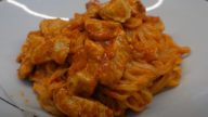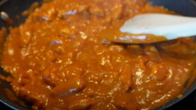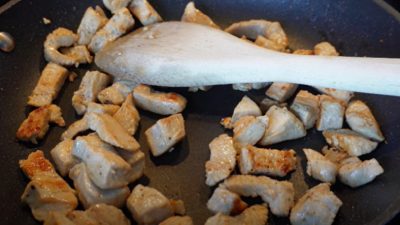 Na pánvi s rozpáleným olejem smažte 4–6 minut nudličky kuřecího masa, které ochuťte solí a pepřem. Poté k nim přidejte rajčatovou omáčku a ingredience zamíchejte.