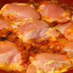 Nyní si připravte kuřecí maso. Můžete použít kuřecí prsní nebo stehenní řízky bez kosti a kůže nebo jakékoli kuřecí kousky, z kterých odstraňte kůži, osolte a opepřete a rozložte na paprikovou cibuli. Podlijte trochou vody a duste asi 7 minut pod pokličkou.