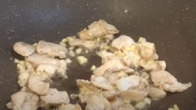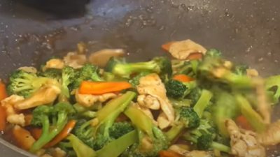 Po minutě pokrm zalijte světlou sójovou i ústřicovou omáčkou, přilijte vodu a také tmavou sójovou omáčku. Na závěr do pánve přidejte kukuřičný škrob, rozpuštěný ve 2–3 lžicích vody a po 2 minutách smažení pokrm odstavte z tepla.