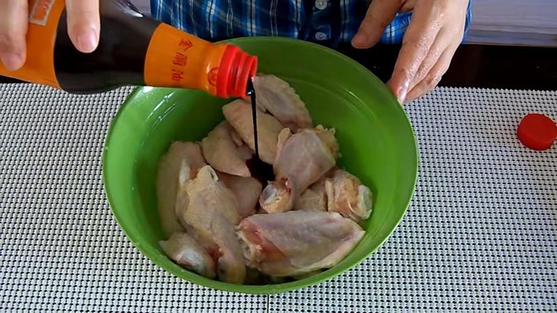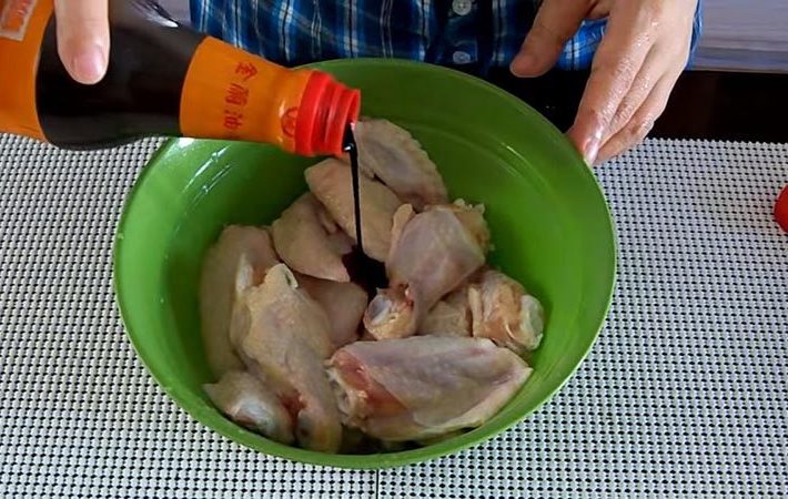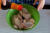 Do mísy vložte omytá a očištěná kuřecí křídla. Poté je zakápněte sójovou omáčkou a dobře rukama promíchejte.