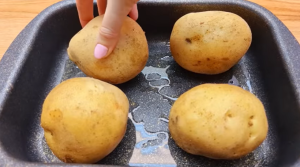 I když se jedná o jídlo masové, začíná se přílohou. Brambory důkladně omyjte a očistěte, budou se používat se slupkou. Pomocí nože v nich udělejte několik řezů. Potom hlubší pekáček pomažte dostatkem oleje a brambory na něj položte. Takto zamíří do trouby rozehřáté na 200 stupňů. Doba pečení bude s ohledem na velikost brambor asi 40 minut.