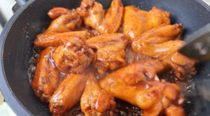 Kuřecí křídla vložte do mísy. Posypte je jedlou sodou a následně zalijte vodou tak, aby byla ponořena. Několikrát je promíchejte a ve vodě omyjte. Poté vodu slijte a kuřecí křídla nechte okapat a důkladně osušte. Do nepřilnavé pánve nalijte asi 2 lžíce oleje a přidejte 2 lžíce cukru. Začněte zahřívat, dokud se cukr nerozpustí a nevznikne karamelová hmota.