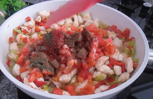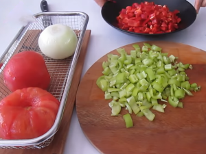 Očistěte červené i bílé papriky od semínek a stopek a nakrájejte je nejprve na jemné kostičky. Cibuli oloupejte a nasekejte ji najemno. Rajčata špičkou nože nakrojte dokola po obvodu, vložte je do cedníku a spařte je vroucí vodou. Pak z nich sloupněte slupku a čistou dužninu nakrájejte na malé kostičky. Kuřecí prsa nakrájejte na podélné proužky a ty rozdělte na menší kousky.