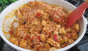 Lahodné kuřecí kousky smažené v čerstvé zelenině jsou krásně provoněné mátou a novým kořením. Rýži pak nasypete přímo do pánve s masem a zeleninou, a tak je dokonale ochucená ostatními surovinami, s nimiž tvoří dokonalou kompozici.