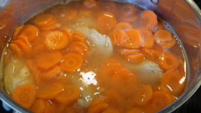 Jakmile se maso zatáhne, ochuťte ho solí, pepřem a přidejte k němu na kolečka nakrájenou oloupanou mrkev.