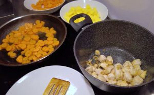 Kuřecí prsa nakrájejte na kostičky. Brambory oloupejte, omyjte a rovněž je nakrájejte na kostičky. Mrkev oloupejte a nakrájejte na kolečka. Na pánvi rozehřejte menší množství oleje a orestujte na něm kuřecí prsa, poté je přemístěte do hlubokého hrnce a dále na pánvi osmažte ještě mrkev. Dejte ji do hrnce ke kuřeti a přidejte i brambory.