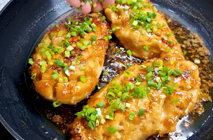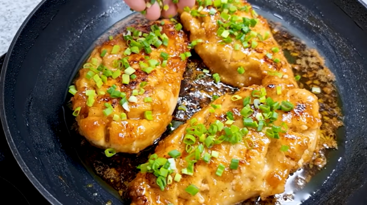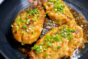 Mezitím si oloupejte česnek a nakrájejte jej nadrobno. Maso v pánvi osolte a opepřete, snižte teplotu na střední intenzitu. Přidejte máslo a nakrájený česnek do pánve, za stálého míchání pak postupně med, sójovou omáčku a jablečný ocet (lze nahradit vinným). Připravovanou omáčku přiveďte k varu, poté opět snižte plamen na střední stupeň. Maso duste, dokud omáčka nezhoustne, pravidelně míchejte a prsa otáčejte. Nakonec prsa posypejte nadrobno nakrájenou jarní cibulkou.