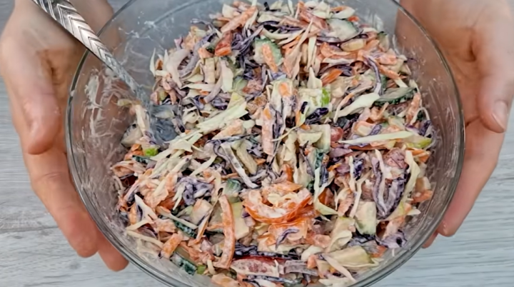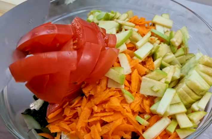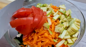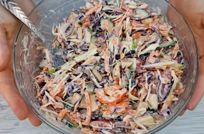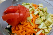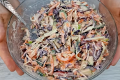 Během dušení masa si připravte zeleninový salát. Nakrájejte najemno bílé a červené zelí a vložte do dostatečně hluboké nádoby, poté přidejte nakrájenou červenou cibuli, papriku, salátovou okurku, nastrouhanou mrkev, na kostičky nakrájené jablko a rajče. Zalijte šťávou z jedné poloviny citronu.