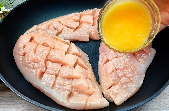 Jak připravit parádní kuřecí prsa s delikátní omáčkou? Nejprve kuřecí prsa omyjte, odstraňte přebytečný tuk a osušte pomocí papírové utěrky. Poté si je položte na prkénko a ostrým nožem proveďte šikmé i kolmé zářezy, aby vznikla mřížka, ale nechte maso pohromadě. Talíř nebo pracovní desku pomoučněte a maso obalte z obou stran. Do pánve dejte rozehřát máslo na střední plamen, poté zvyšte teplotu. Maso opékejte zprudka po dobu 2–3 minut, následně otočte a pečte dozlatova i z druhé strany.