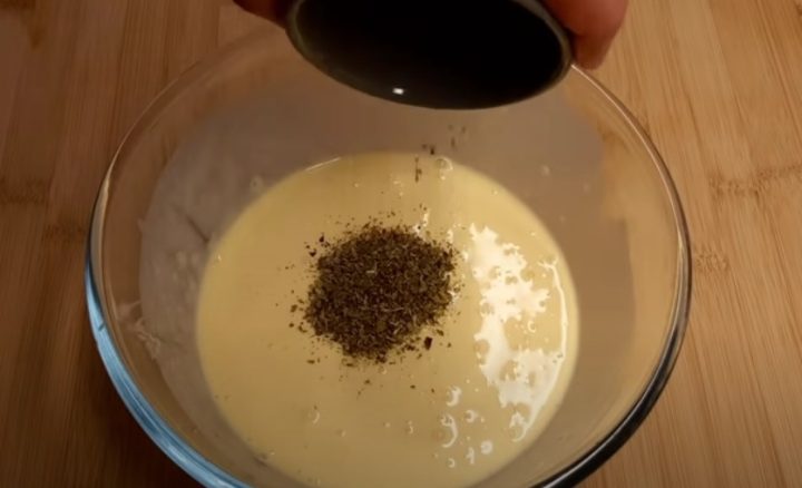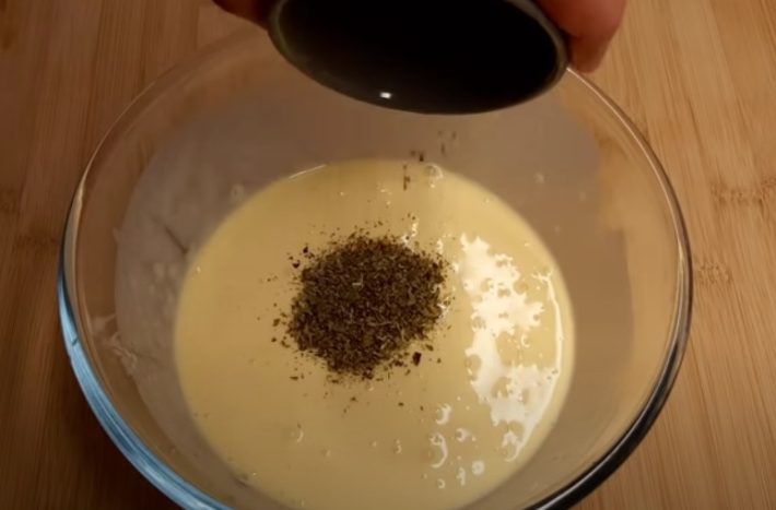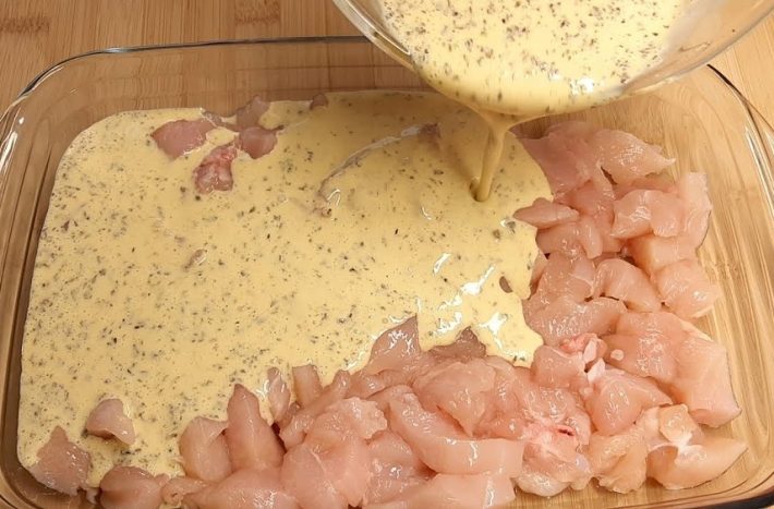 Kuřecí prsa rozkrájejte, osolte a dejte do zapékací mísy. V misce rozšlehejte vejce, přidejte smetanu, provensálské bylinky, oregano, kari a pepř. Zamíchejte, nalijte k masu, promíchejte a vše zakápněte trochou olivového oleje.