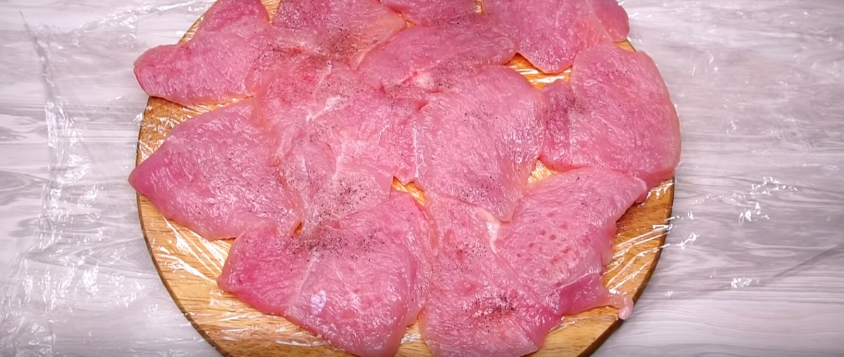 Na prkénko položte kus potravinářské fólie, na tu rozložte kuřecí maso a zakryjte druhou fólií. Přes tu pak paličkou plátky jemně naklepejte (fólie zabrání rozstřikování tekutiny z masa do všech stran). Pak sloupněte igelit a posypejte z obou stran plátky masa solí a mletým černým pepřem.