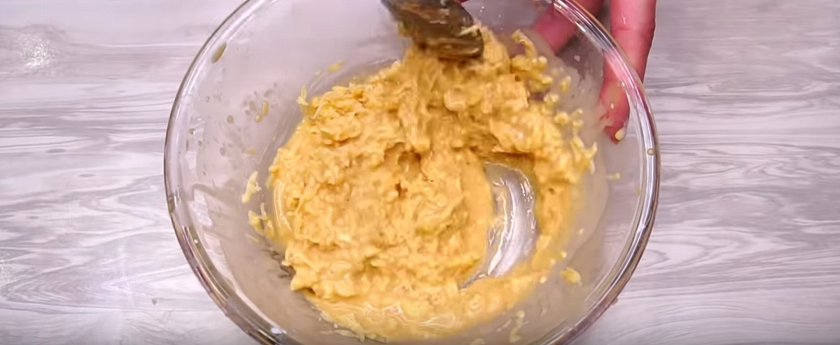 Do hluboké mísy vyklepněte dvě vajíčka, přidejte k nim jednu polévkovou lžíci sójové omáčky a dvě lžíce majonézy nebo zakysané smetany. Zahustěte škrobem a smíchejte do hladké a jednolité konzistence. Na jemném struhadle nastrouhejte sýr a přidejte ho do misky se smetanovou směsí. Opět dobře promíchejte.