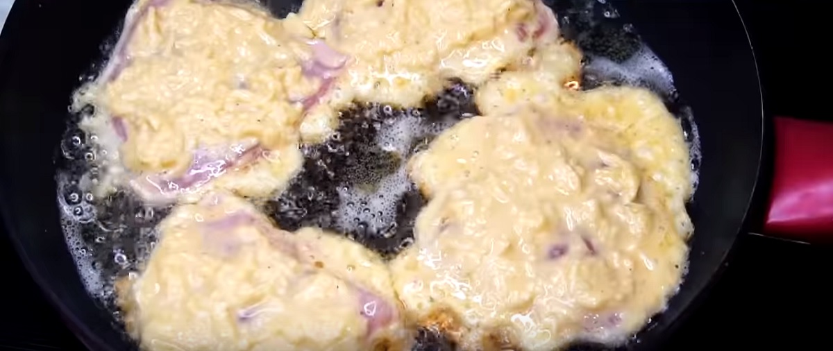 Nejspíš na mase nebude držet, proto rukou rozetřete těstíčko po jedné straně masa a tou ho položte do rozehřáté pánve.