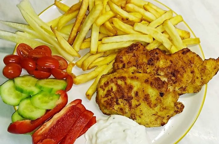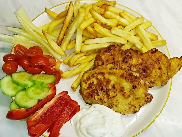 Kuřecí plátky po osmažení ihned podávejte spolu s bramborovými hranolky, tatarskou omáčkou a oblohou z čerstvé zeleniny.