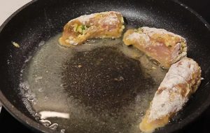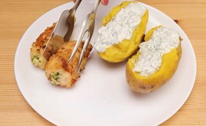 Na pánvi rozehřejte rostlinný olej a do větší mísy nasypejte mouku. Kuřecí rolky vždy obalte v mouce, poté ve vejcích a následně znovu v mouce. V takovém stavu je dejte okamžitě smažit do pánve, z obou stran je smažte po dobu pěti minut do zlatova. Brambory vytáhněte z trouby, vybalte je z alobalu a vyčkejte pět minut, než vychladnou. Poté je rozdělte na dvě poloviny.