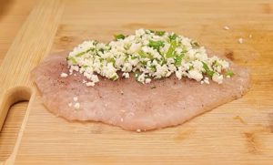 Obojí důkladně rozmělněte vidličkou. Na každé prso naneste přiměřené množství náplně a srolujte ho. Poté všechny rolky přeřízněte na polovinu, čímž získáte celkem 12 rolek. Do větší mističky rozklepněte dvě vejce a přidejte k nim dostatečné množství soli. Rozšlehejte je metličkou.