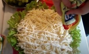 Nastrouhejte vařená vejce na hrubém struhadle a dejte je na salát. Na nich opět udělejte mřížku z majonézy a posypejte ji zbytkem ořechů. Kuličky hroznového vína rozpulte a vyskládejte je na salát řezem dolu. Salát poté dejte na pár hodin do lednice, aby se chutě uležely, a pak servírujte.