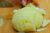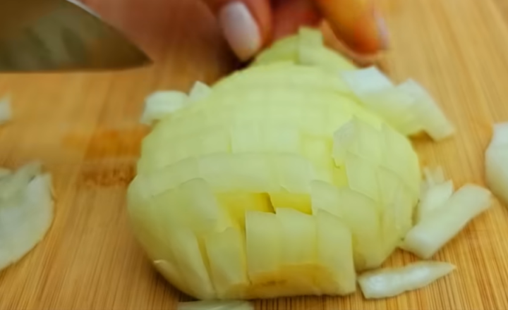 Vezměte kopr, umyjte ho, osušte a nakrájejte ho na zhruba centimetrové kousky. Nasypte ho na talířek a nechte ho na později. Další přípravnou prací je nastrouhání sýru na hrubém struhadle. I sýr dejte stranou a nakrájejte si cibuli. Oloupejte ji, překrojte na polovinu a dále z ní nakrájejte větší kostičky. Na pánev nalijte trochu oleje, ten rozehřejte a nasypte cibuli, kterou začněte restovat.