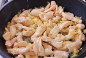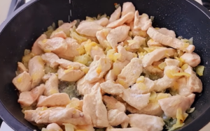 Kuřecí prsa omyjte, očistěte a nakrájejte je na silnější nudličky. Takto připravené maso vložte do pánve k restované cibuli a začněte zprudka opékat, aby se kuře dobře zatáhlo a udrželo potřebnou šťavnatost. Restujte do doby, dokud maso nebude hotové a měkké.