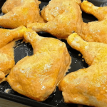 Druhý den marinovaná stehna vyndejte z lednice a vyskládejte je na pekáč vymazaný slunečnicovým olejem, nebo ještě lépe máslem. Stehna by se navzájem neměla dotýkat, aby se dobře propekla. Vyskládaná stehna potřete trochou marinády, ale tak, aby z nich pokud možno neokapala. Stehna dejte péct do trouby předehřáté na 180°C, dokud nezezlátnou. Obvykle to trvá 40-50 minut. V polovině pečení můžete stehna potřít ještě trochou marinády.