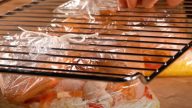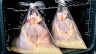 Jakmile maso v surovinách důkladně obalíte, naplňte jím sáčky, které uzavřete a přivažte k roštu trouby. Rošt s kuřaty vraťte do trouby tak, aby sáčky volně visely a pokrm pečte v předehřáté troubě na 180 °C po dobu 40 minut.