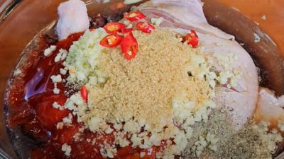 Kuřecí stehna nechte marinovat 1 hodinu, z marinády je vyjměte a smažte je 4–6 minut z každé strany, dohněda. Poté je marinádou zalijte, zakryjte je a vařte 10 minut.