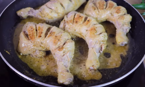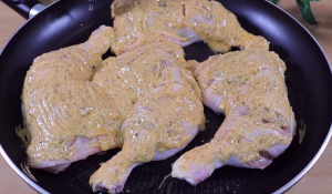 Nejprve připravte marinádu. V misce smíchejte dvě polévkové lžíce bílého jogurtu s jednou lžičkou soli, tymiánu, kari koření a sladké papriky. Přidejte dvě lžíce oleje a dobře promíchejte. Očištěná kuřecí stehna několikrát příčně nařízněte, vložte je do velké pánve.