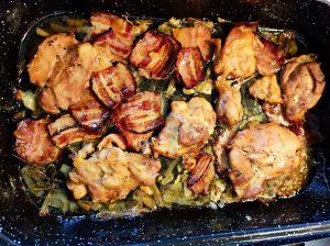 Zatímco se kuře peče, v pánvi nechte zvolna opéct dozlatova plátky anglické slaniny. Po uplynutí první doby pečení odkryjte pekáč s kuřetem, položte na každé stehno plátek opečené slaniny, do pekáče přidejte oříšek másla a nechte odkryté dopékat dalších 30 minut, aby maso získalo krásně zlatavou barvu.